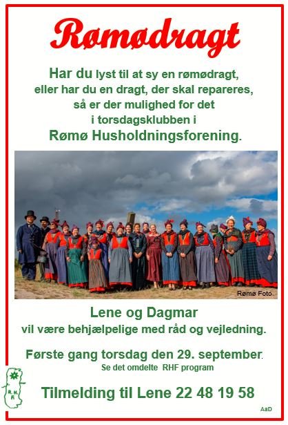RHF – Torsdagsklubben – Rømødragt syning og reparation Skrevet af Lena Boulton Hansen Aktiviteter august 26, 2022 Har du lyst til at sy en Rømødragt, eller har du en dragt der skal repareres, så er der mulighed for det i torsdagsklubben i Rømø Husholdningsforening. Del på Facebook InfoLand nyhederLokalVores arealanvendelse og klima i...Hobbyudstilling med smukt...JulefokostJulemarked i BallumKommunalDer er ingen indlæg